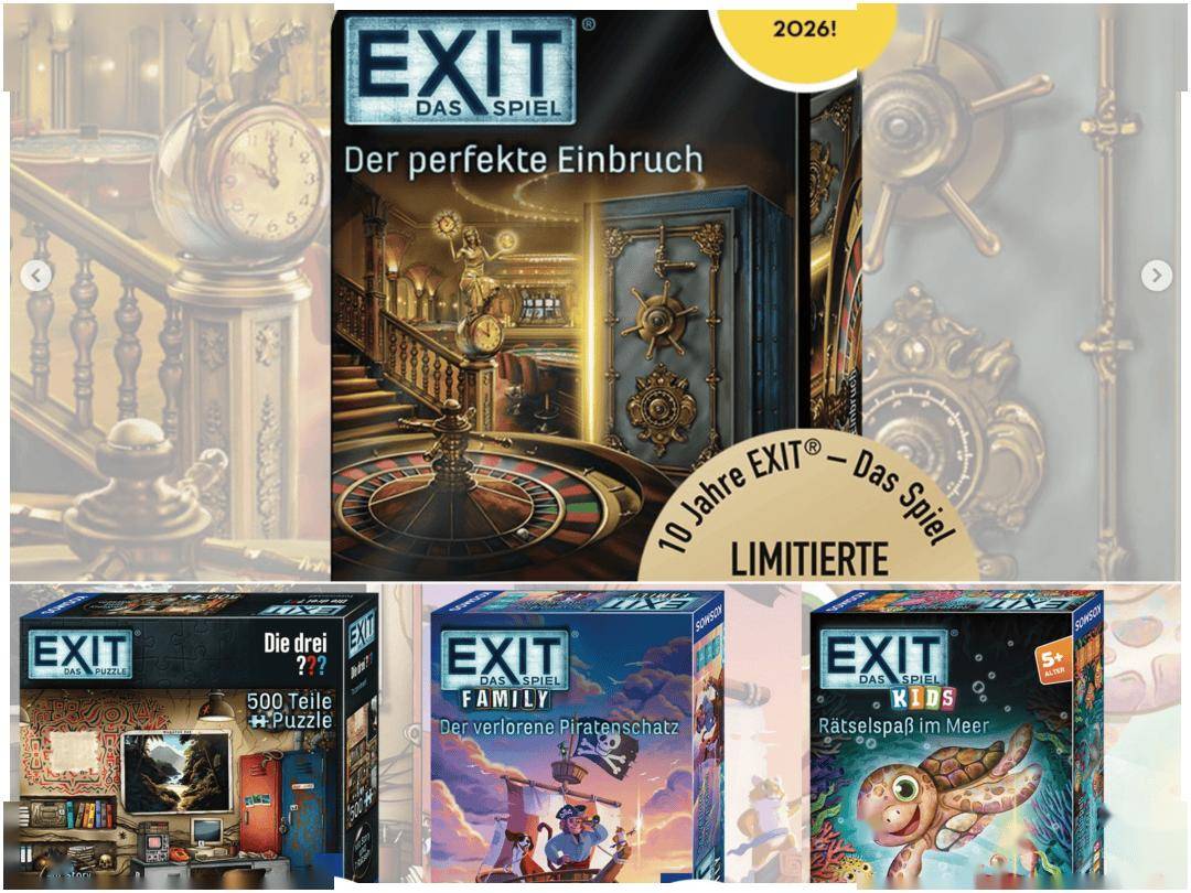 第二项则是KOSMOS的另一个知名招牌《EXIT》,这款即将迎来10周年的桌游也将在明年迎来四部全新作品。其中最值得关注的就是限量的周年纪念版 《EXIT: Das Spiel – Der perfekte Einbruch》,其中包括了一些特制的额外的“小玩意”和特殊谜题。而后续还将发行三款难度不同的新谜题。
