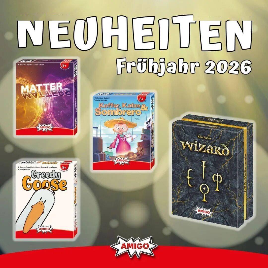 此外AMIGO还将在明年发行三款卡牌游戏,包括Tsutomu Dejima设计的2-4人游戏《Matter Matters》,Christian Kudahi设计的《Koffer,Katze & Sombrero》和George Feledichuk等三人联手设计的2-6人游戏《Greddy Goose》,三款游戏的时长均在20分钟左右。