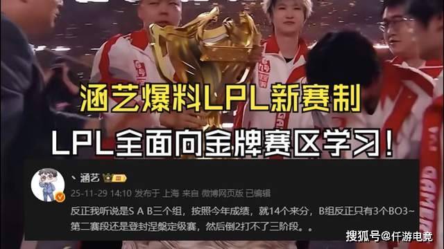 LPL知名爆料人涵艺在个人社交平台上透露:明年S16赛季,LPL将使用新赛制,分成S、A、B三个组。并且第二赛段还是登峰和涅槃的定级赛,然后倒2打不了第三赛段。