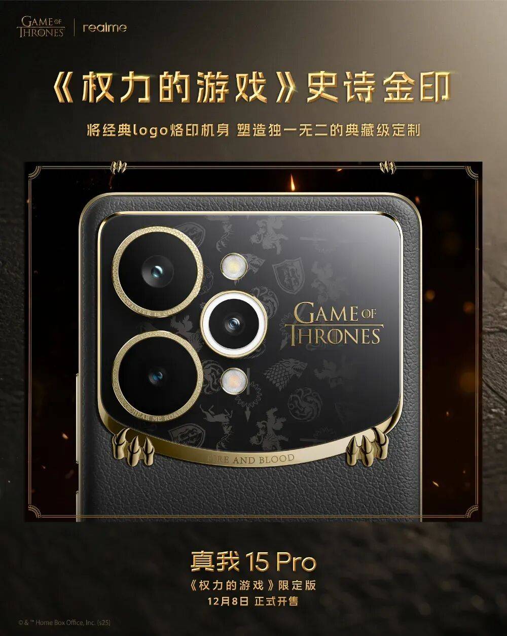 据悉,真我15 Pro《权力的游戏》限定版12月8日限量发售,融合经典IP元素深度定制。