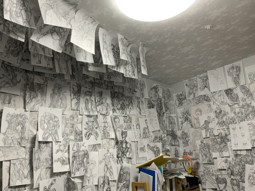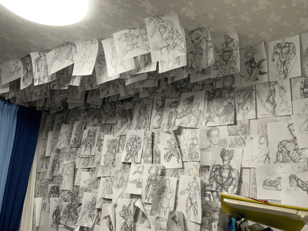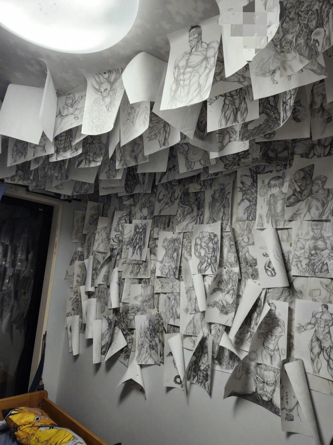 经过几年的发展,他的画功和肉体一样得到了很大提升,而前几天,他房间里的画作开始在网上流传,网友们一看——哇喔……这真的是这个肌肉佬画的吗?不得了啊!