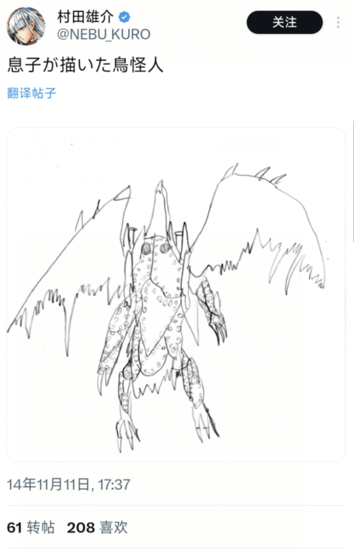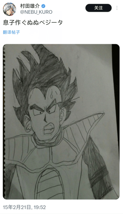 当然,作为漫画家的孩子,圭介遗传了他爸的艺术细胞,从小看他爸画点什么,自己也乐意去创作点什么,村田雄介以前也经常在推特上分享圭介的创作。