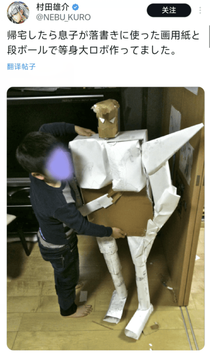 “回到家后,看到俺儿用涂鸦过的画纸和纸箱做了一个等身大小的机器人。”