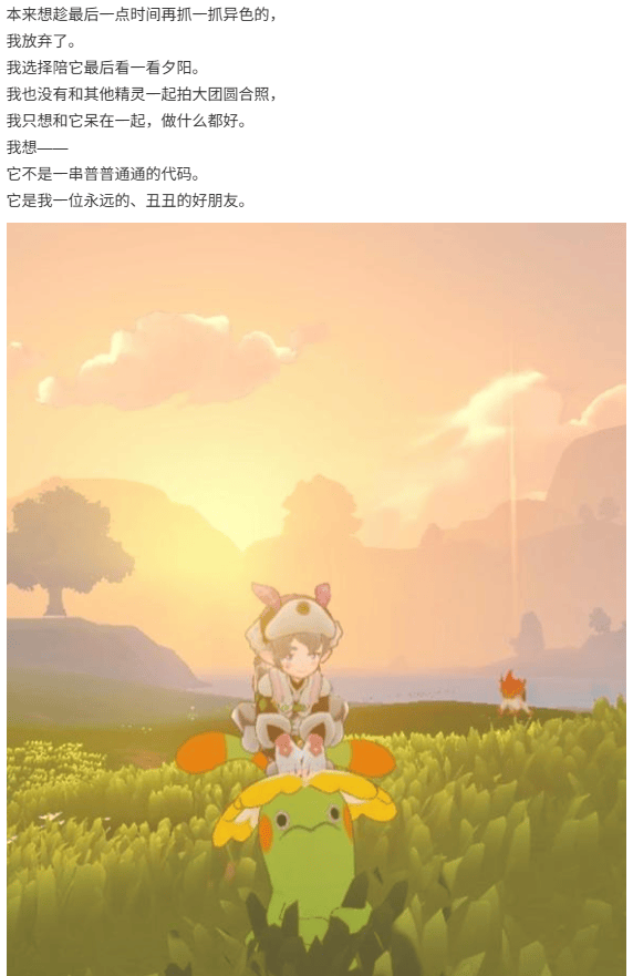 帖子中,这位玩家自述到了活动最后时刻,才发现陪自己最久的伙伴不符合带走的条件,注定只能等来一场分别,于是干脆把剩余的时间都留给了这只精灵,还写下长文纪念了这位小小的朋友,全文真挚又细腻,字里行间都渗透着那种孩童般的纯粹情感……这种由陪伴创造的感情连接,也是捉宠游戏最想传递给玩家的体验。