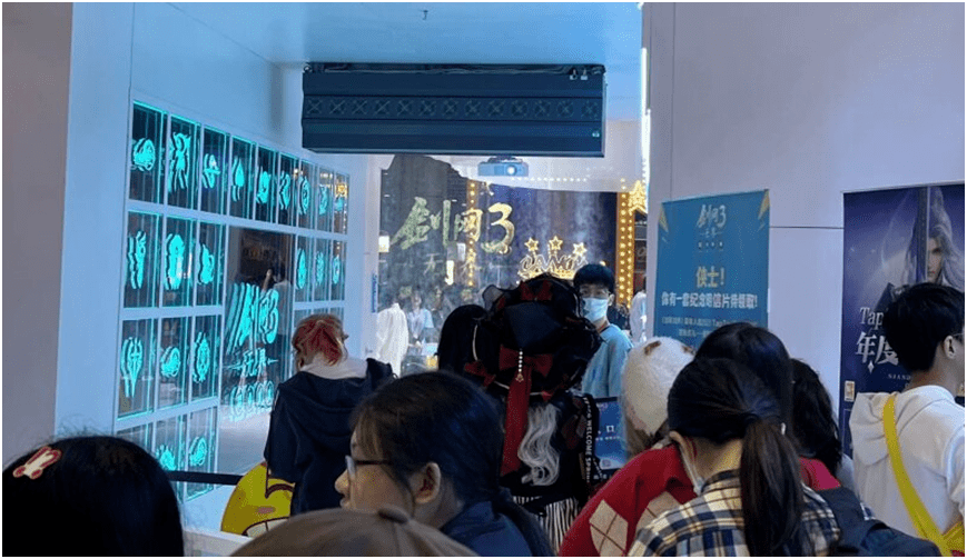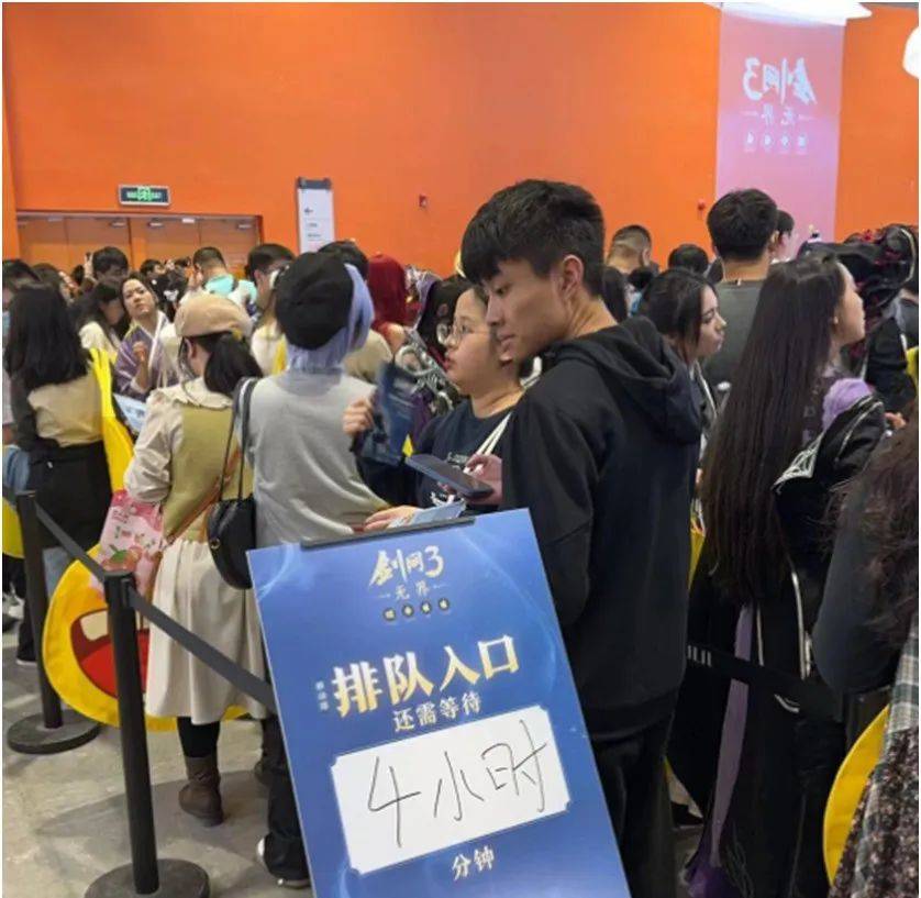 而从各大展台的流量来看,剑三展台无疑是首日“最靓的仔”,诸多玩家刚进展就直奔剑三展台,目标之明确,令不少路人玩家都为之侧目。而玩家的热情也带来了连锁反应,才刚开展10分钟,剑三展台试玩无界的玩家就已经排起了长队,甚至达到“排队4小时才能玩上无界”的程度,着实离谱。