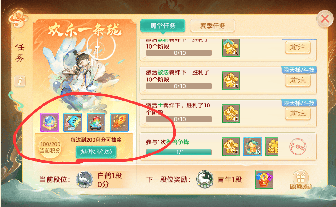 完成周常任务、赛季任务可以获得任务积分,只限制天梯/斗技赛可以获得,达到200积分之后可以进行“欢乐一条珑”抽奖,有概率获得聚魄丹、见闻录等奖励。