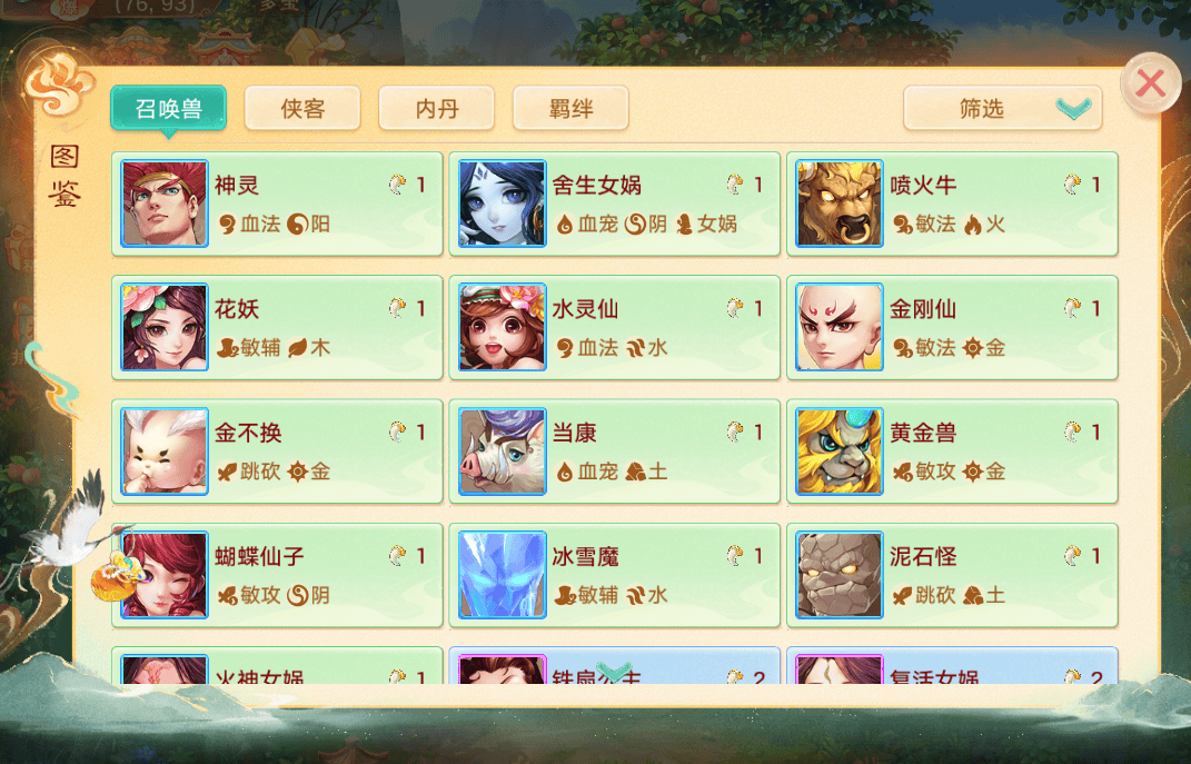 后期可以凑成这套火系敏法流,需要的召唤兽比较少。凑成“6敏法+3火”羁绊,最终成型阵容是:小颜如玉+凤凰+喷火牛+雨师+金刚仙,支援宝宝用颜如玉即可。