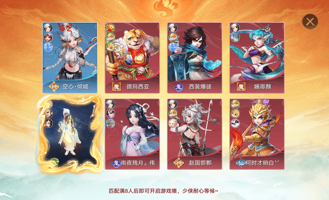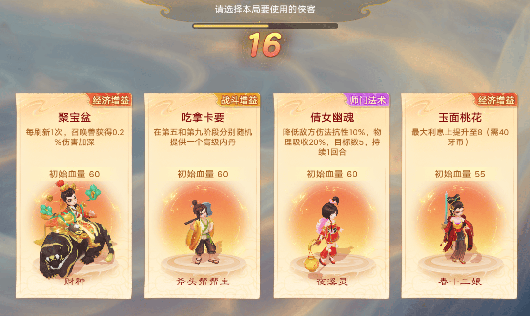 每一局开始前,玩家可以选择一个侠客,每一个侠客拥有一个被动技能和初始血量,比如财神聚宝盆技能:每刷新一次,召唤兽会获得0.2伤害加深,可以给我们带来经济增益。