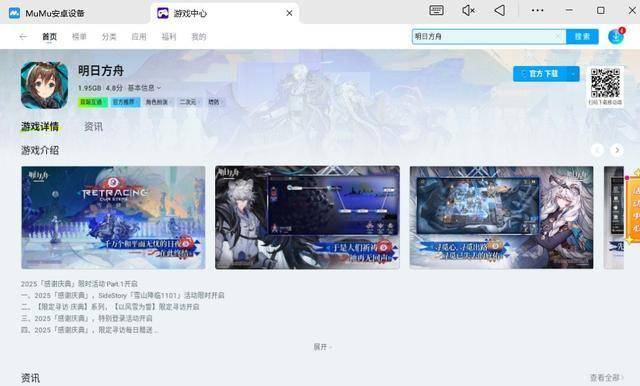 方法一:启动模拟器,在游戏中心搜索“明日方舟”,点击下载。