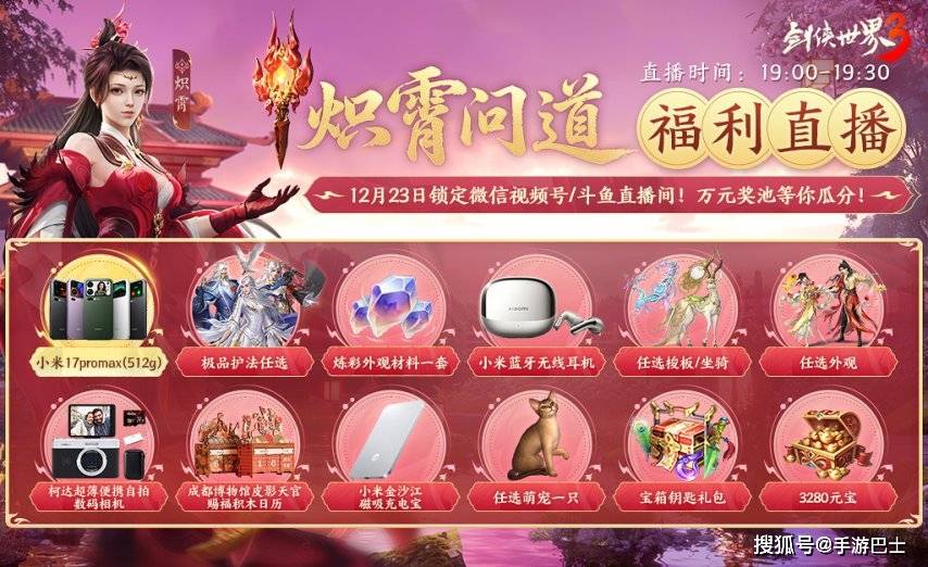“炽霄问道”资料片嘉年华开启,各位少侠不仅可以在游戏内参与新版本各项活动,也可以在【炽霄问道直播盛典】抽取多重豪华大奖!参与游戏内日常活动获得兑换材料,集齐后兑换好礼有机会获得直播抽奖券、护法招募券、红包兑换等。拥有抽奖券的少侠可参与官方直播间活动,小米17pro max、小米无线耳机Buds 5 Pro、柯达超薄便携相机、成都博物馆皮影积木日历、小米金沙江磁吸充电宝、任选在售外观等绝品大礼等你抽取!