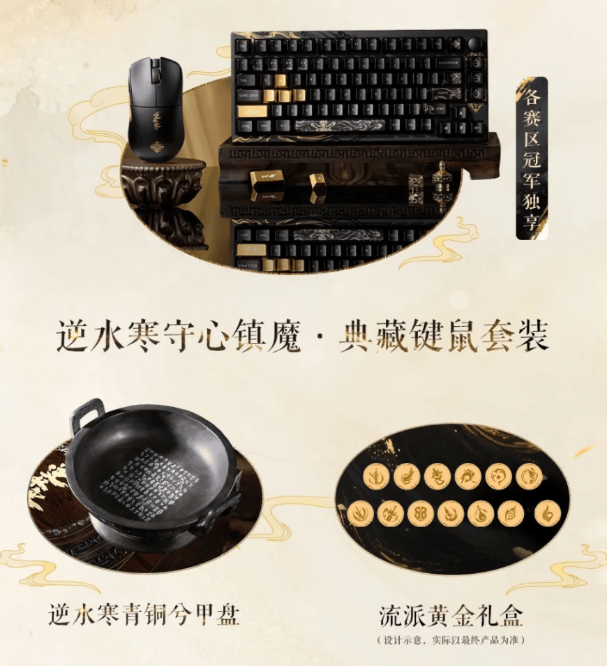 这些实物奖励,是《逆水寒》专门订制的超豪华周边套装,比如逆水寒守心镇魔・典藏键鼠套装、复刻国宝青铜兮甲盘、含 13 流派纯金金币的流派黄金礼盒、逆水寒订制一醉轻王侯五粮液等珍稀周边,每一项在玩家群体中都炙手可热,被炒出天价。而现在只要能够在诸神之战比赛中获得名次,就能打包带走,跟帮会中的兄弟分享。