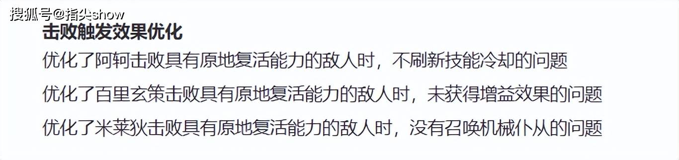 另外阿轲、百里玄策、米莱狄攻击复活的目标时,技能效果进行了优化,阿轲击败复活甲目标也能刷新技能,百里玄策则可以触发加速被动,米莱狄可以召唤仆从,后期大加强。