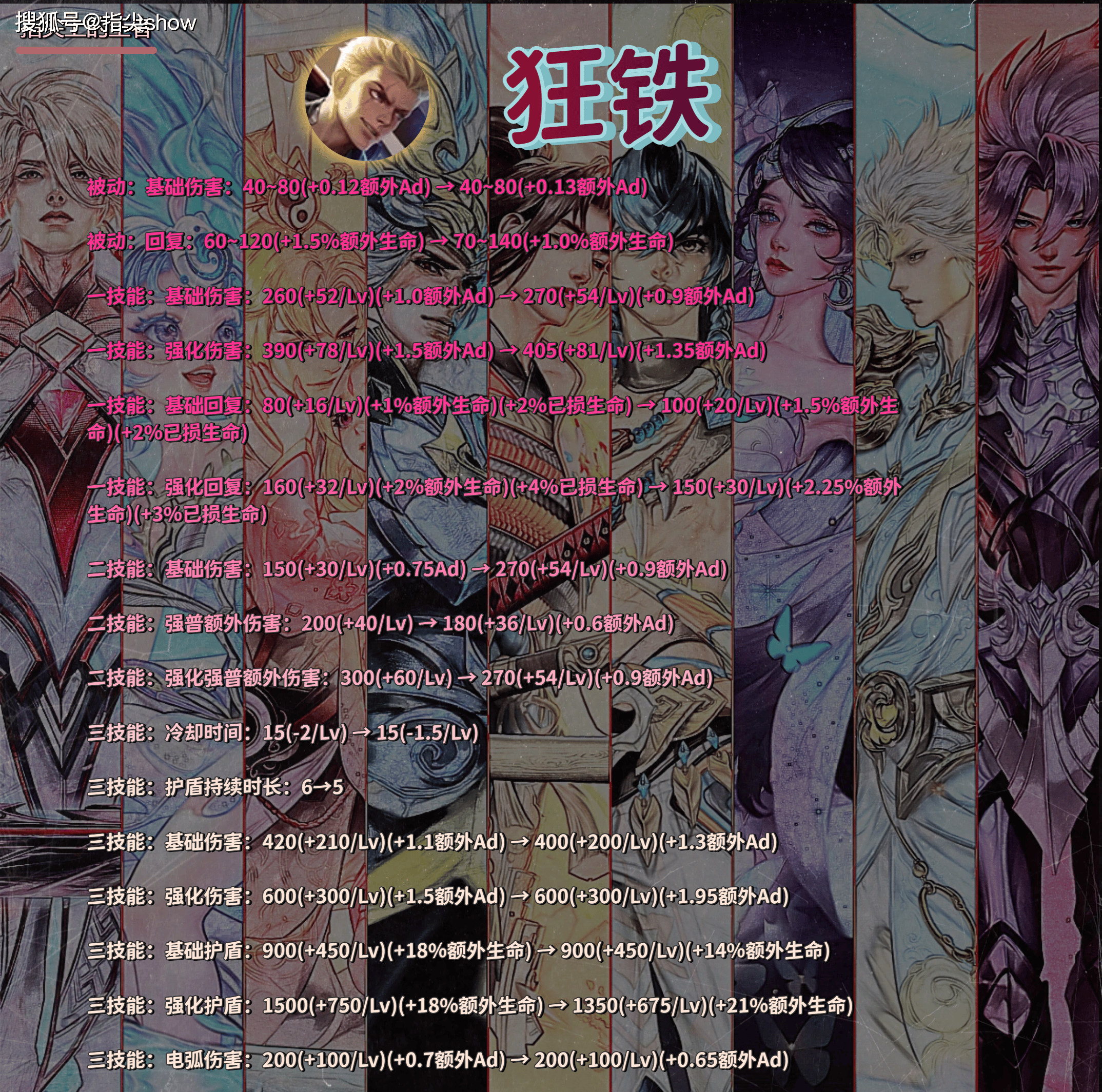 一技能削弱伤害加成,加了一点基础数值,回血部分大加强,不过强化一技能的回血砍了1%已损生命值加成,加了一点额外生命值加成。