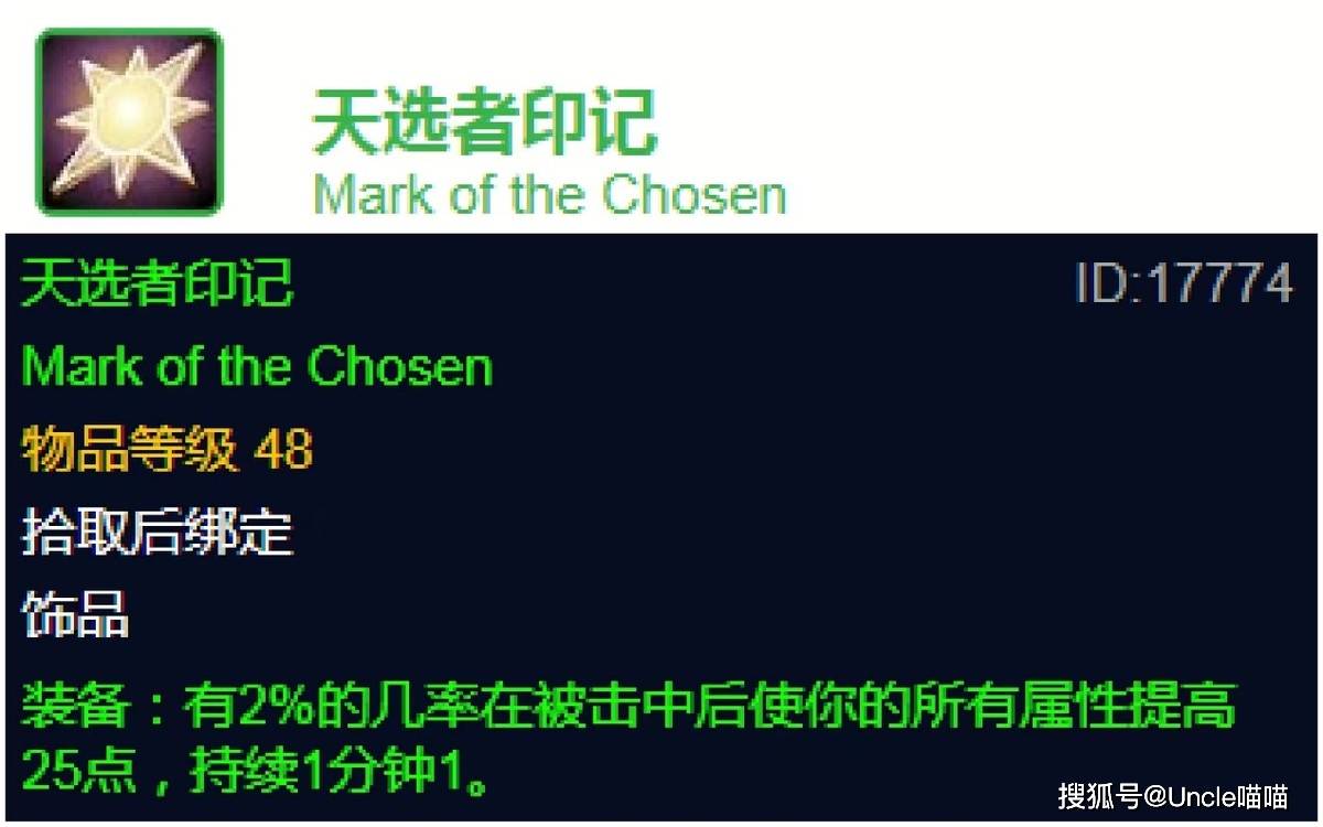 对于能够提高全属性的天选者印记,喵叔也是怀旧服时期经高人指点才知道他的存在,是凄凉之地任务“贱民的指引”获取,这东西对于熊T那就是神一样的饰品,搭配附魔的饰品能够用完整个地球时代也没问题,另外就是喜欢单刷的盗贼也必备他,特别是刷军需官有他没他那真的是天差地别的既视感!不知道各位盗贼大兄弟是否拥有过?