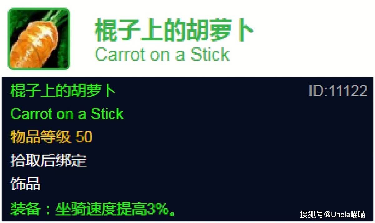 对于闪光平原任务“加兹瑞拉”奖励的胡萝卜,他应该是90%魔兽玩家第一款填充饰品栏的装备了,而他也更加是魔兽世界玩家使用时间最长的绿色饰品之一了,有着绝对的超模实力,3%的坐骑速度提高对于千金马是传说的年代,跑图打团做任务都是必备极品了,可别小看这3%的速度提高,在小马之间他会肉眼可见的拉开你们之间的距离,所以称得上是有实力又极度情怀的饰品!