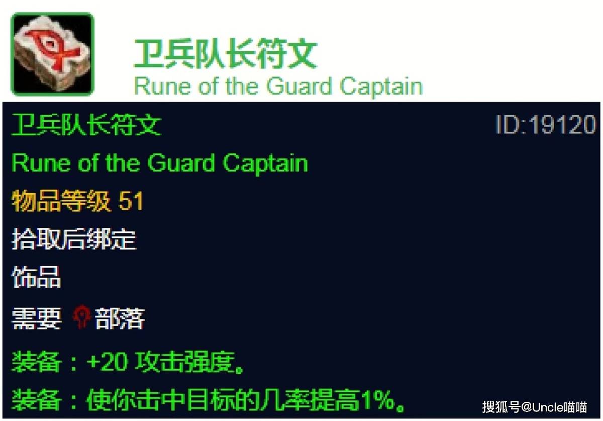 部落专属饰品卫兵队长符文,超模实力就简单粗暴了,人送外号小龙牙,一个物品等级只有51的绿色饰品,却坐拥20点常驻攻击强度和1%的命中几率提高,你找谁说理去,99%的联盟玩家看了都要流哈喇子,还有1%不走寻常路的联盟大兄弟直接因为他转部落阵营了,就问问你怕不怕?另外这东西不仅输出好用,对于很多拿不到龙牙饰物补命中容错的战士T佩戴也嘎嘎好使,您别说,喵叔永久60服的战士至今备着以防不时只需。