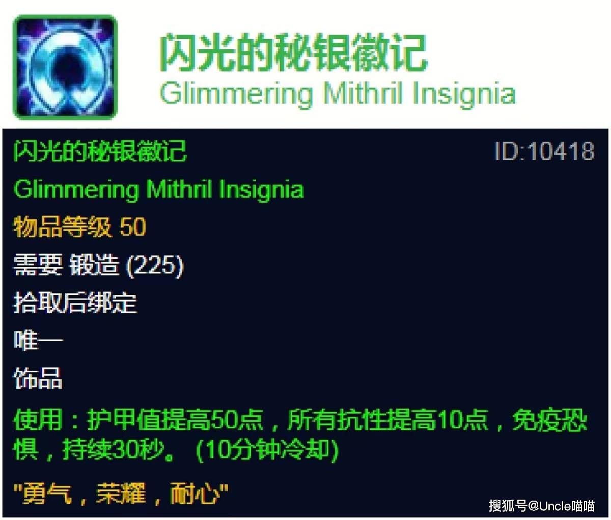 前面两款饰品名气大的很恐怖如斯,而第三款的闪光秘银徽记知道且使用过的基本上是纯粹老玩家无疑,这东西是锻造出品,他的超模实力就在于30秒硬核的免疫恐惧效果了,对于战士而言,有了他,妈妈再也不用担心被术士大爷恐惧的找不到北了,如果30秒内你还没将敌对的术士斩于马下,那么只能说你们的等级跨度有点大了。屏幕前有没有专业锻造大佬使用过的,来谈一谈你的感受!