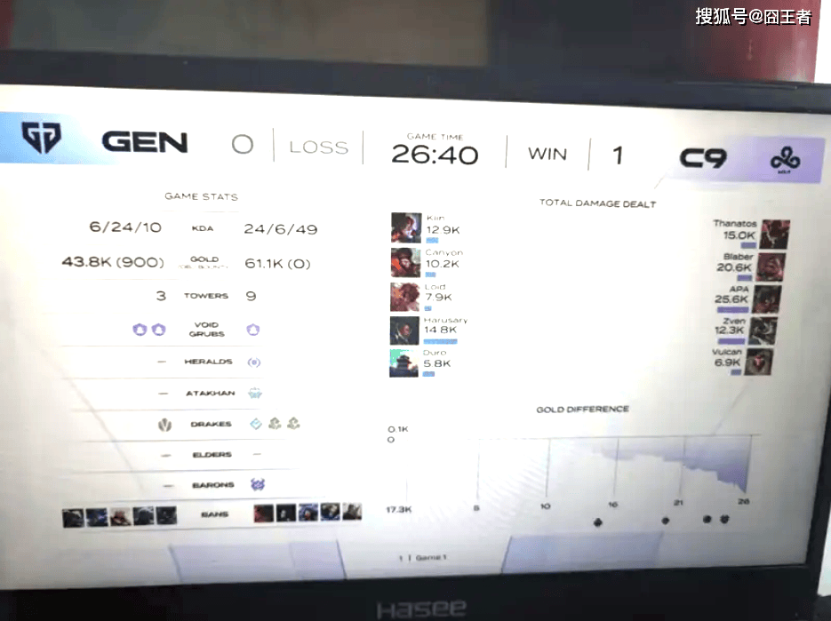 因此就不难想象了,由于Chovy和Ruler不在,Gen被C9在27分钟内碾压了一万七的经济