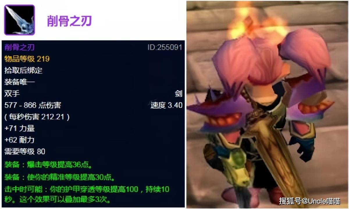 就目前时光服第一团本熔火之心整体情况来说,难度达到了99.9%玩家的心里预期,无论说是战斗难度还是说BOSS机制,都能够让玩家完美契合,2个小时左右的团本时间也是让玩家没有了长时间战斗的疲倦,可谓魔改很成功了。回归正题,第一款最热门的紫色极品给到削骨之刃,目前热度是非常高的,基本上属于金团核心职业狂暴战必备武器,但是这几天他的实战也暴露了大问题,喵叔之前以为能够常驻的300点护甲穿透等级提升,玩家实装之后发现叠的太过于敷衍了,不知道后期会不会对这一被动效果进行必要的修正,不然在精准不缺的时候是随时有可能被拉格纳罗斯的脊骨收割者给替换的。