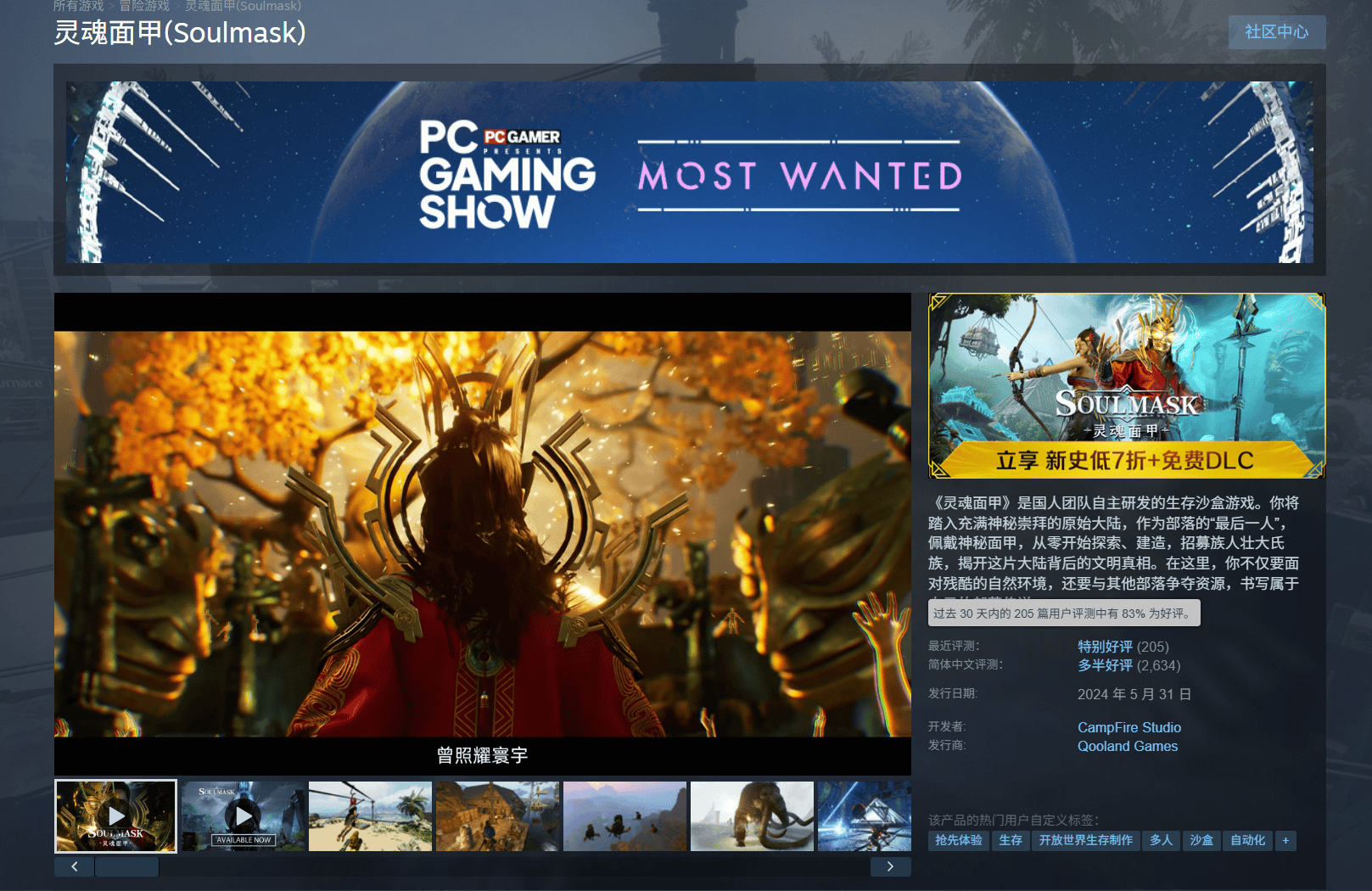 steam链接:https://store.steampowered.com/app/2646460/Soulmask/