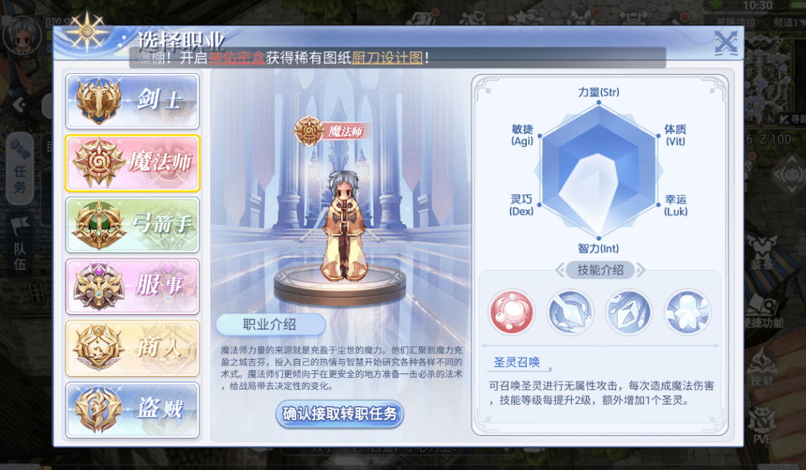 初次进到游戏里,玩家跟着新手引导任务做到十级之后,玩家就会迎来第一次选择职业,总共有着六种职业可供玩家选择,每个职业都有这自己的技能和特点,分别有勇猛无双的战士,魔力强大的魔法师,敏锐强大的弓箭手,温柔善良的服侍,精通贸易的商人和隐匿无双的刺客。