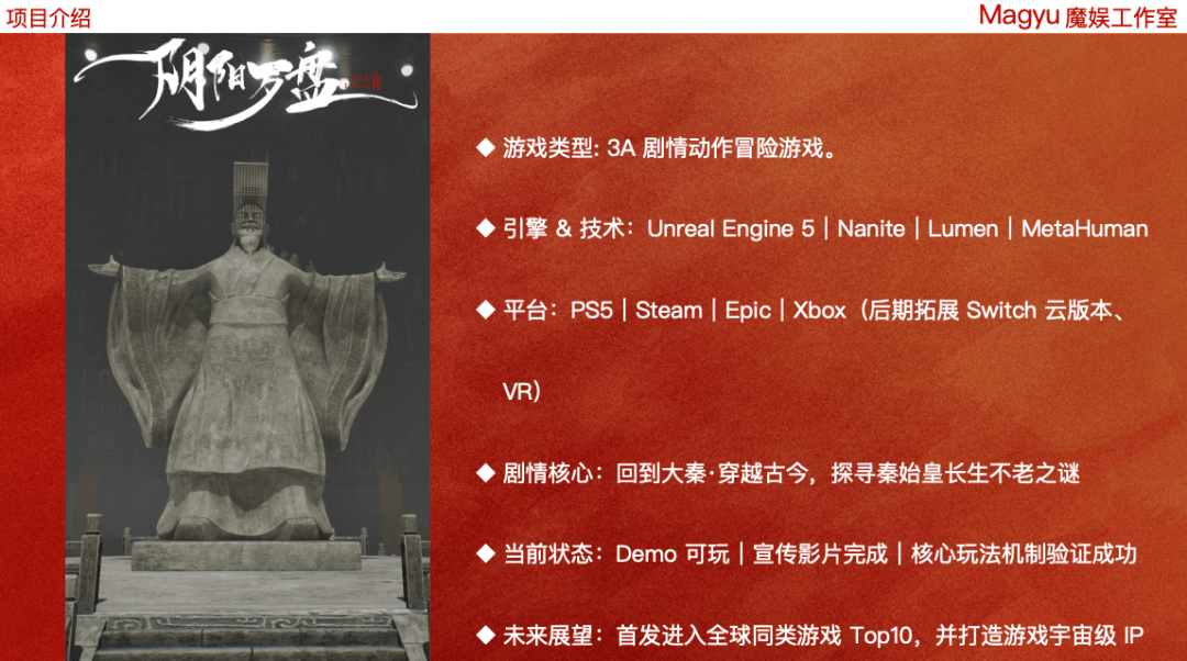 开发团队拥有18年游戏行业经验,曾于2021年推出好评率94%的单机作品《蛊婆》,并具备自研技术栈与动作捕捉、虚拟摄影棚等开发条件。目前游戏已进入DEMO制作与发布阶段,正在寻求首轮融资,计划于2027年第四季度在PS与Steam平台同步发售。