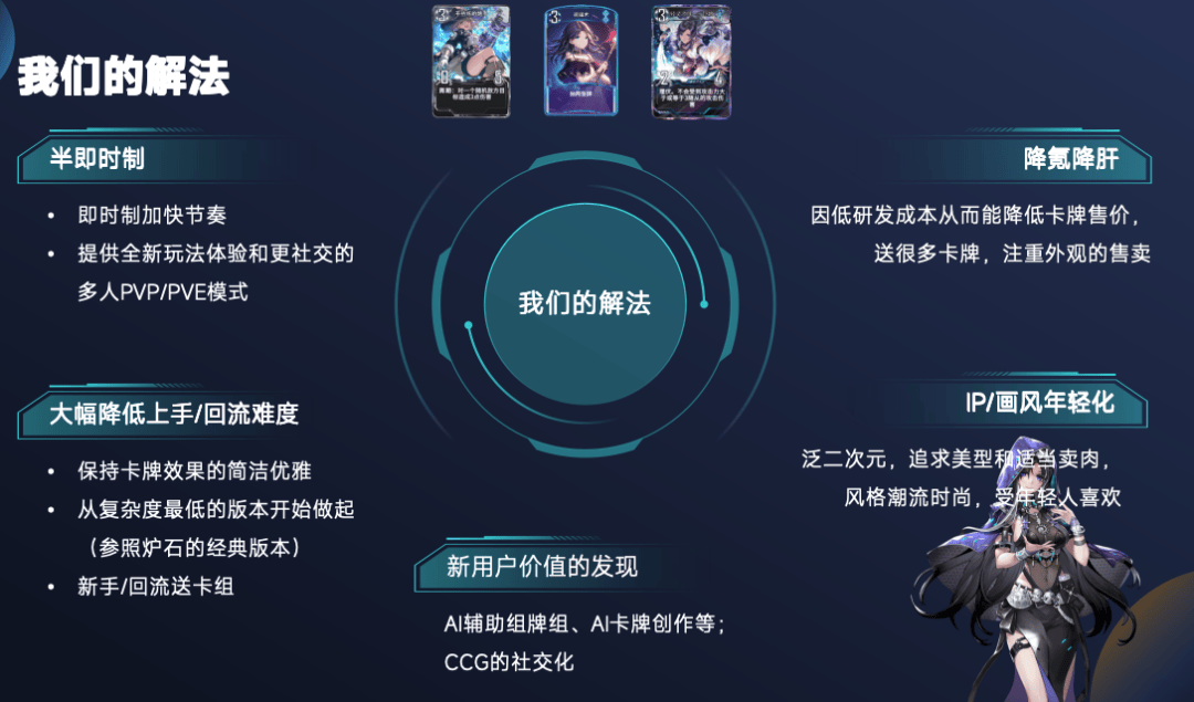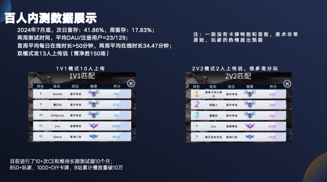 据悉,该游戏团队核心成员拥有腾讯、育碧等公司经验,并具备AI技术背景。目前游戏已进行多次测试,其中于2024年7月底测试的次日留存达41.86%,周留存达17.83%。两周测试时间,平均DAU/注册用户=23/129;首周平均每日在线时长>50分钟。目前团队正在寻求融资以致力于打造全球首款卡牌对战UGC平台。