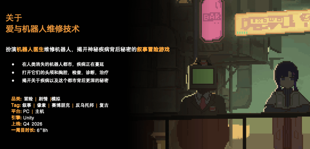《机器人维修技术》是一款像素风赛博朋克叙事冒险游戏,玩家扮演机器人医生“露丝”,在人类消失的城市中维修机器人并探寻神秘疾病背后的真相。游戏融合模拟要素,核心玩法围绕对机器人进行“望闻问切”——通过交谈、检查内部模块、诊断并治疗其故障,每个病例都承载着独特的故事与伦理选择。