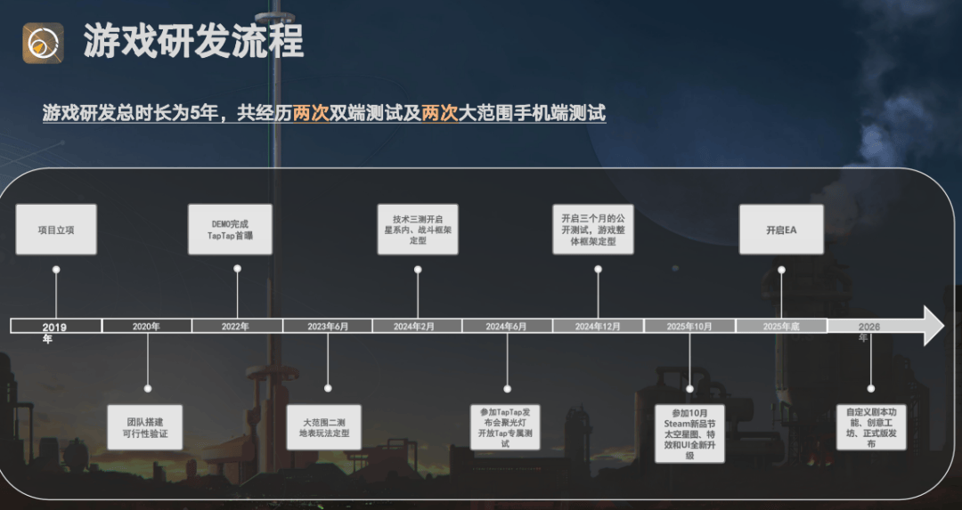 据悉,该游戏研发历时已超五年,期间共进行过两次双端测试与两次大规模手机端测试,计划于今年年底上线抢先体验( EA)版本,并于2026年陆续实现自定义副本、创意工坊支持及正式版发布。在2024年12月开启的为期三个月的公开测试中,游戏累计预约量突破24万,曾登上TapTap新品榜第二位,测试期间点击率超过5%,详情页转化率亦高于20%,显示出较强的玩家关注与期待。