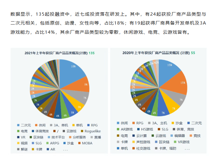 据游戏陀螺在21年整理发布的投融资报告显示,21年,仅前半年发生行业投融资中有24起与二次元相关,占比最高,达18%,其余品类共分剩余的82%。