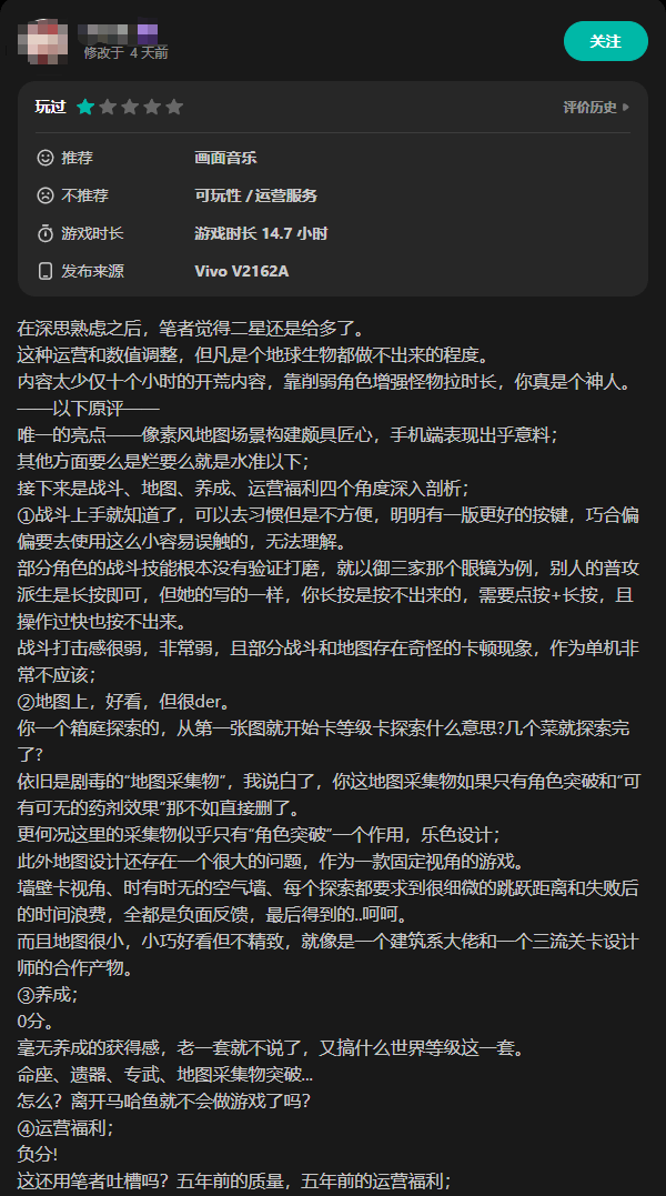 在这段时间中,这款没有人看好的二游,交出了与这份看衰匹配的答卷:畅销榜查无此游、TapTap等平台的玩家评论区也被差评占领。