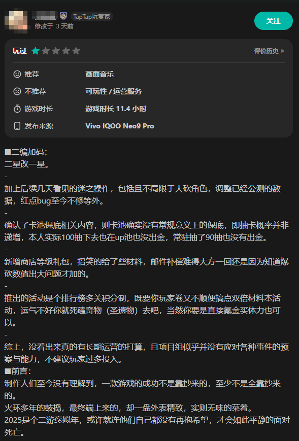 再加上,《巡回列车》《野火流明》等项目或中途夭折或生死未卜的案例在先,玩家也意识到,一款二游能熬到正式上线已属幸运,开服之后还可能随时暴毙。在这样的背景下,玩家不再无限期预支耐心给所谓“潜力股”,一次测试体验糟糕可以算你在打磨,三次测试还是没有改变,那会被扣上能力不行或者傲慢的帽子。