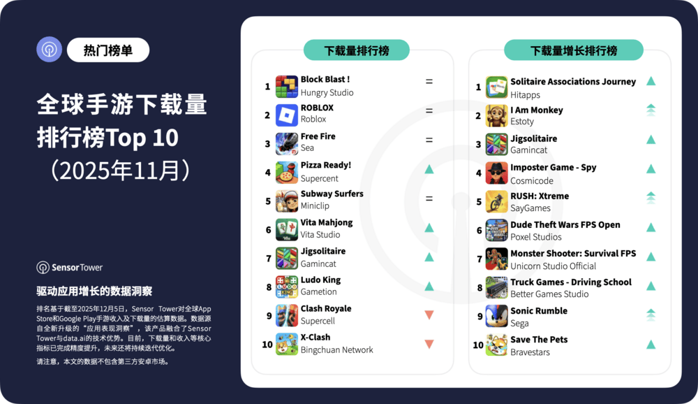 《Block Blast!》登顶2025年11月全球手游下载榜。《ROBLOX》位居第2,紧随其后的是《Free Fire》、《Pizza Ready!》和《Subway Surfers》,共同跻身前五。