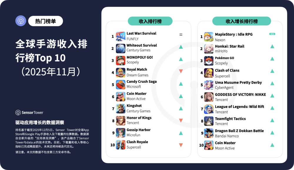 新游戏的发行、里程碑式的更新以及运营活动的复苏,共同构成了11月收入增长榜单的主要特征: