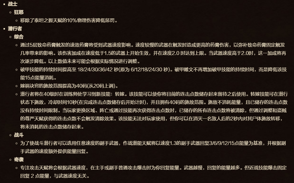 其实,这几天已经有不少大佬向官方提议,加强盗贼和战士。而就在今天,官方正式发布时光服蓝贴,对这两职业进行调整,战士将移除泰坦之握天赋的10%物理伤害降低惩罚,而盗贼则对毒药、破甲、嫁祸等多个技能进行调整。