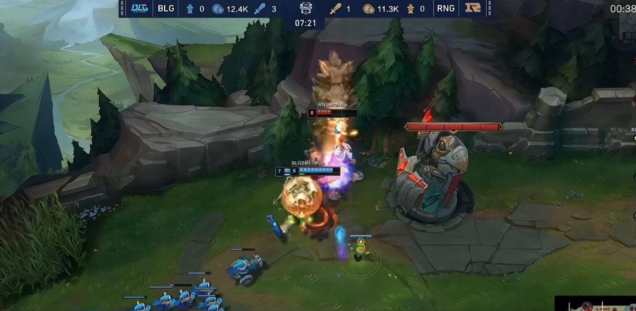 第二个名场面来自于RNG与BLG的比赛,BLG上单选手Bin使用兰博上单,在比赛中尝试配合Xun进行一波上路的越塔。
