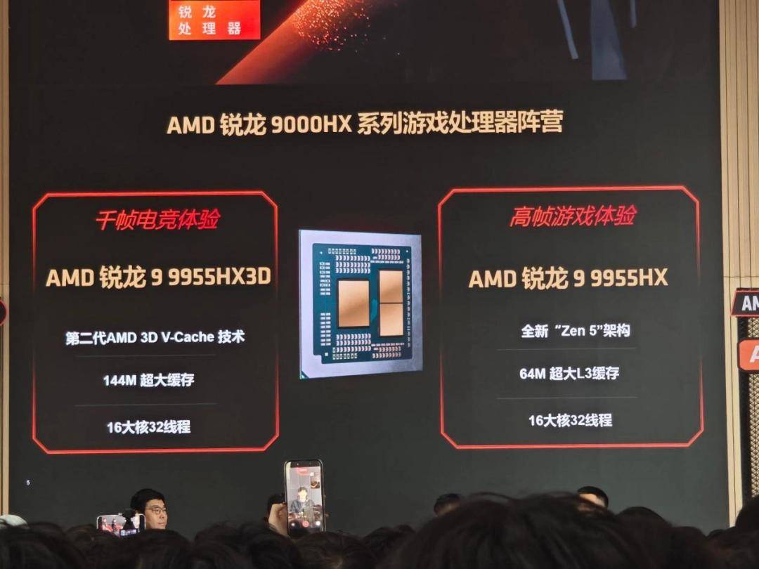 于是你可以看到,现场除了提供包括联想拯救者R9000P 2025、华硕 天选6 Pro、ROG 魔霸9、机械革命 苍龙16 Ultra等,时下最热门且均搭载了AMD全新锐龙9000HX系列处理器的“梦中情机”,可以现场让玩家们自由上手体验外,各个品牌也派出了专门的负责人,上台用幽默风趣地讲解,详细为玩家们介绍了这些旗舰新品的功能特色。更出人意料的是,作为各品牌的管理层精英,他们各个登台后也都相当“有活”——有人不停带着玩家喊“AMD,Yes!”,被我身后的路人调侃像是在搞“明星粉丝见面会”,也有人能轻松接上玩家们抛出的各种网络流行梗,引发大伙接连为其欢呼打call。加上他们毫不吝啬地拿出自家品牌最新款高性能游戏本和掌机,作为现场玩家的抽奖福利,整场活动的气氛被迅速点燃,而紧接着登场的,就是整个“AMD帧香电竞嘉年华”系列活动的核心主角——AMD锐龙9000HX系列处理器。