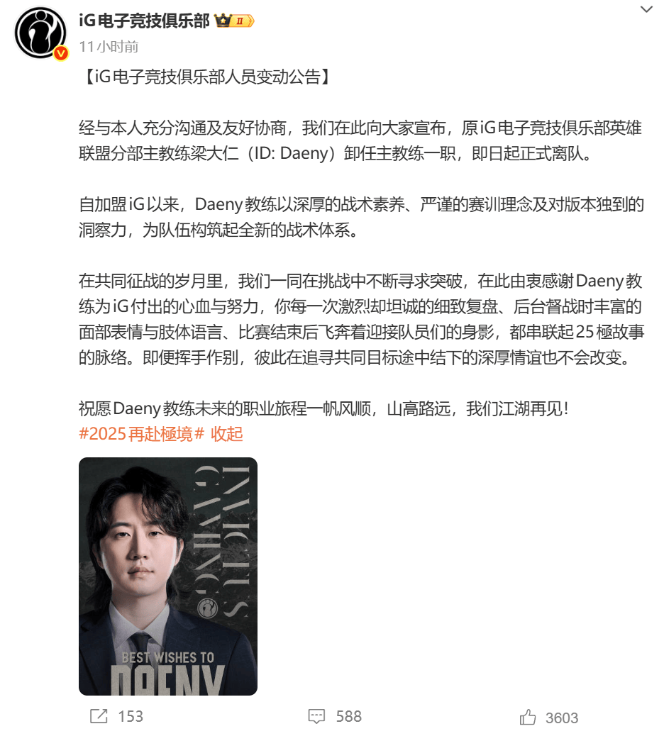伴随着2025LPL转会期最后一天的到来,很多队伍都在这最后时刻公布了队伍的阵容。其中今年一整年外战打得都风生水起的AL,他们也不藏着掖着,简简单单公布了原班人马续约,而教练组则是由一个韩国教练和国产教练搭档,虽然说Tabe走了,但是全新的教练组或许能够带来一些化学反应,当然最重要的就是原班阵容,再冲再闯一年还是很看好他们的!其他队伍之前也基本都已经公布结束了,只有大家心心念的iG迟迟没有动静(除了下路选手Gala离队去JDG)!然而等到这一天也终于开始有所动静了,iG率先公布了丹妮教练的离队,随后在BLG官宣,那个之前在后台留下了非常多经典场面的丹妮,带着他BP上的鬼才天赋走了,之后再见就是对手了!