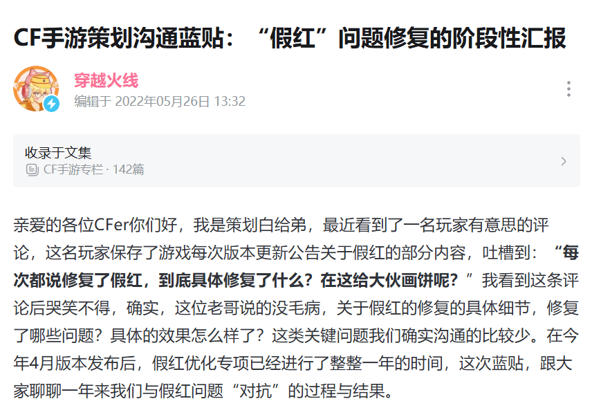 CFM团队花了接近两年的时间来攻克这个问题。从2022年开始,他们通过“开发者蓝贴”、“策划面对面”等形式,向玩家公开解释“假红”的成因,并同步优化的进度。这是一个极其枯燥且见效缓慢的过程。最终,通过采用更先进的服务器帧同步技术和网络补偿算法,CFM在近期的版本中大幅缓解了这个问题,那种“打中不死”的挫败感被显著降低了。