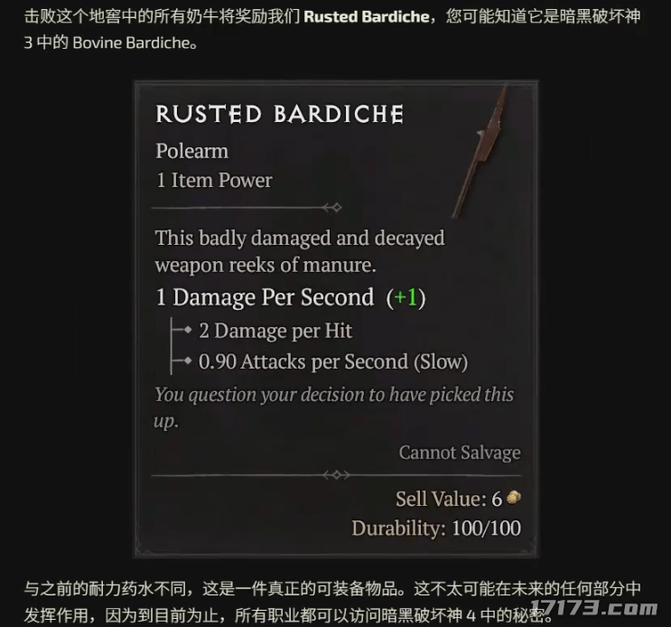 更离谱的是,即便你合成了钥匙,进入了《暗黑破坏神4》的隐藏地点,杀光了其中的奶牛,也只能获得一瓶意义不明的耐力药水。
