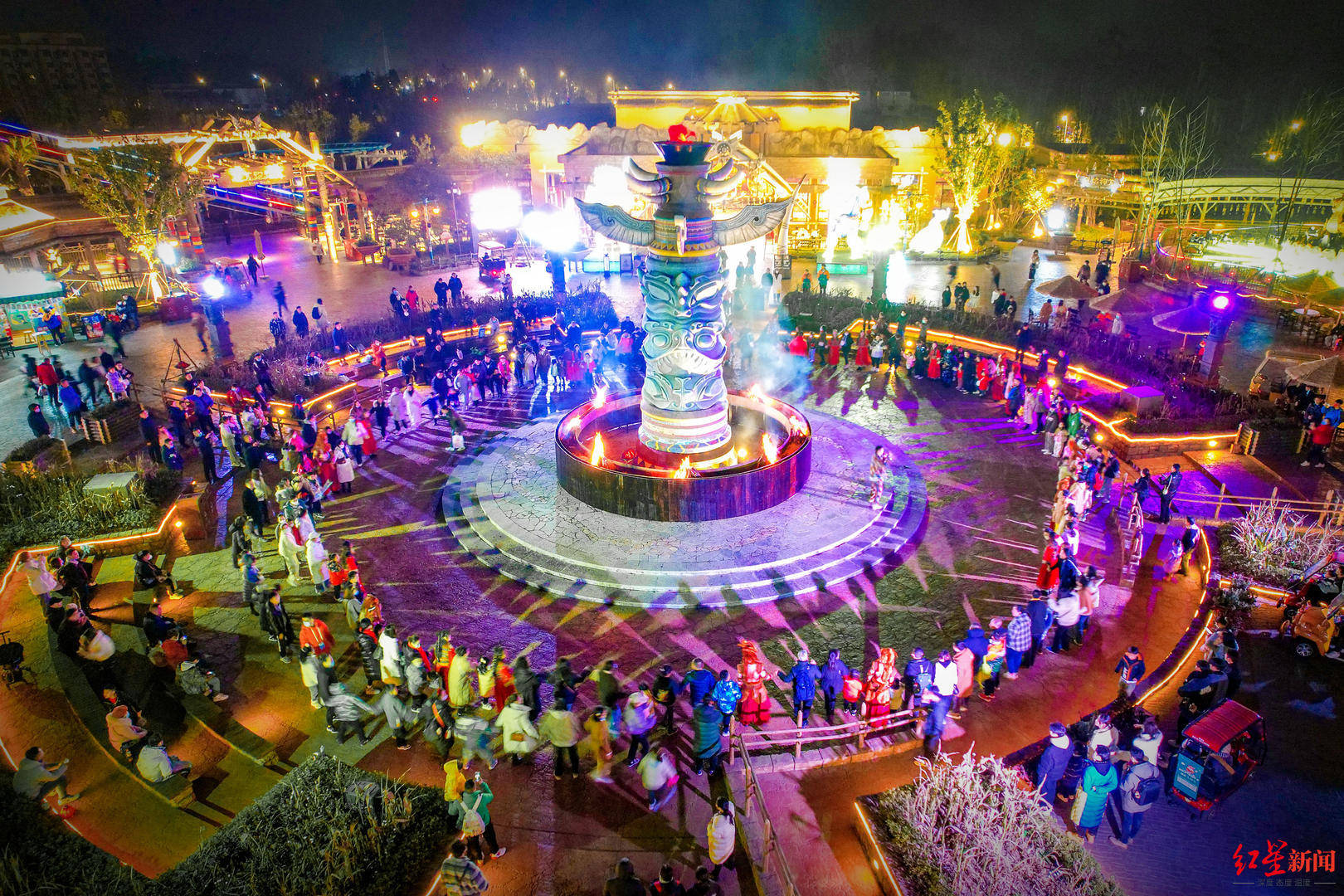 为增强游客体验感,自贡方特在跨年夜当天开启了全新的“冰雪恐龙大巡游”活动。现场,有精灵、冰雪女王、部落酋长等主题NPC现场与游客零距离互动,有欢快的篝火冲天而起,游客们的欢声笑语在游乐园的每个角落此起彼伏。