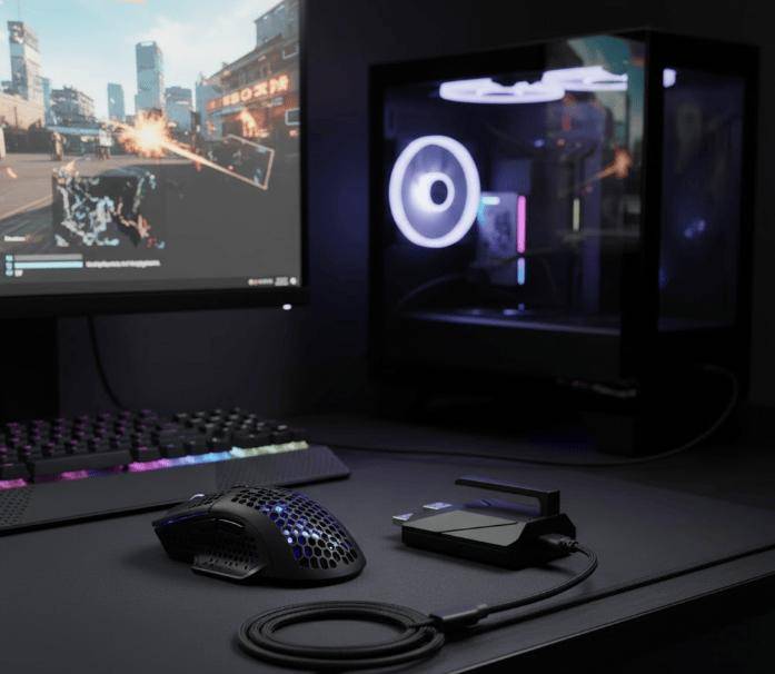 为了应对这些问题,外设行业的主流解决方案是为鼠标配备一个专属的 USB 接收器(俗称“Dongle”),并通过 USB 延长线将其放置在离鼠标更近、干扰更少的位置。这虽然是许多高端游戏鼠标的标配,但本质上也只是权宜之计。因为它不仅组网复杂,破坏了桌面的简洁美学,更重要的是,这种方法只是在“躲避”干扰,而非“解决”干扰。在大型电竞赛事现场等极端复杂的无线环境下,这种被动的回避策略依然可能失效。