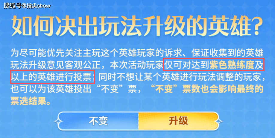 以前玩家投票,可以任意选择,不乏有一些比较随意的玩家把票给了自己从不关心的英雄,所以这次新增了一个小门槛,你只能给打到紫色熟练度及以上的英雄进行投票。