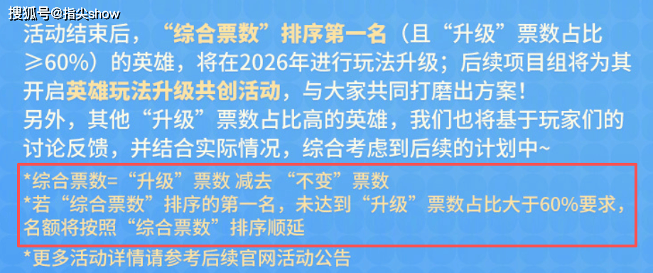 不变就是不想要改变该英雄现状,最终的名单将会是“升级”票数减去“不变”票数的综合票数,综合票数第一的,且“升级”票数达到60%的英雄,将会成为最终在2026年进行升级的英雄。