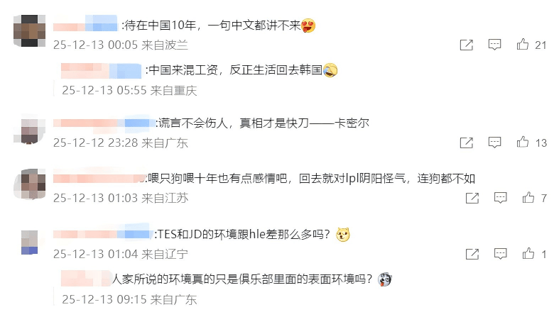 对此,很多玩家都觉得不可思议:“待在中国10年,一句中文都讲不来”,“喂只狗喂十年也有点感情吧,回去就对lpl阴阳怪气,连狗都不如”,“中国来混工资,反正生活回去韩国”……