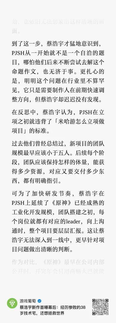 上面这位高管认为,之所以会陷入这种纠结的境地,一般都是因为项目在立项阶段就有硬伤。在理想情况下,公司应该限制早期资源投入,制定清晰的里程碑,在人最少的时候解决最难的方向性问题,严格控制量产阶段的开发时间……但纵观游戏行业,有多少人有决心、有能力严格执行这一切?哪怕强如蔡浩宇,也无法幸免。