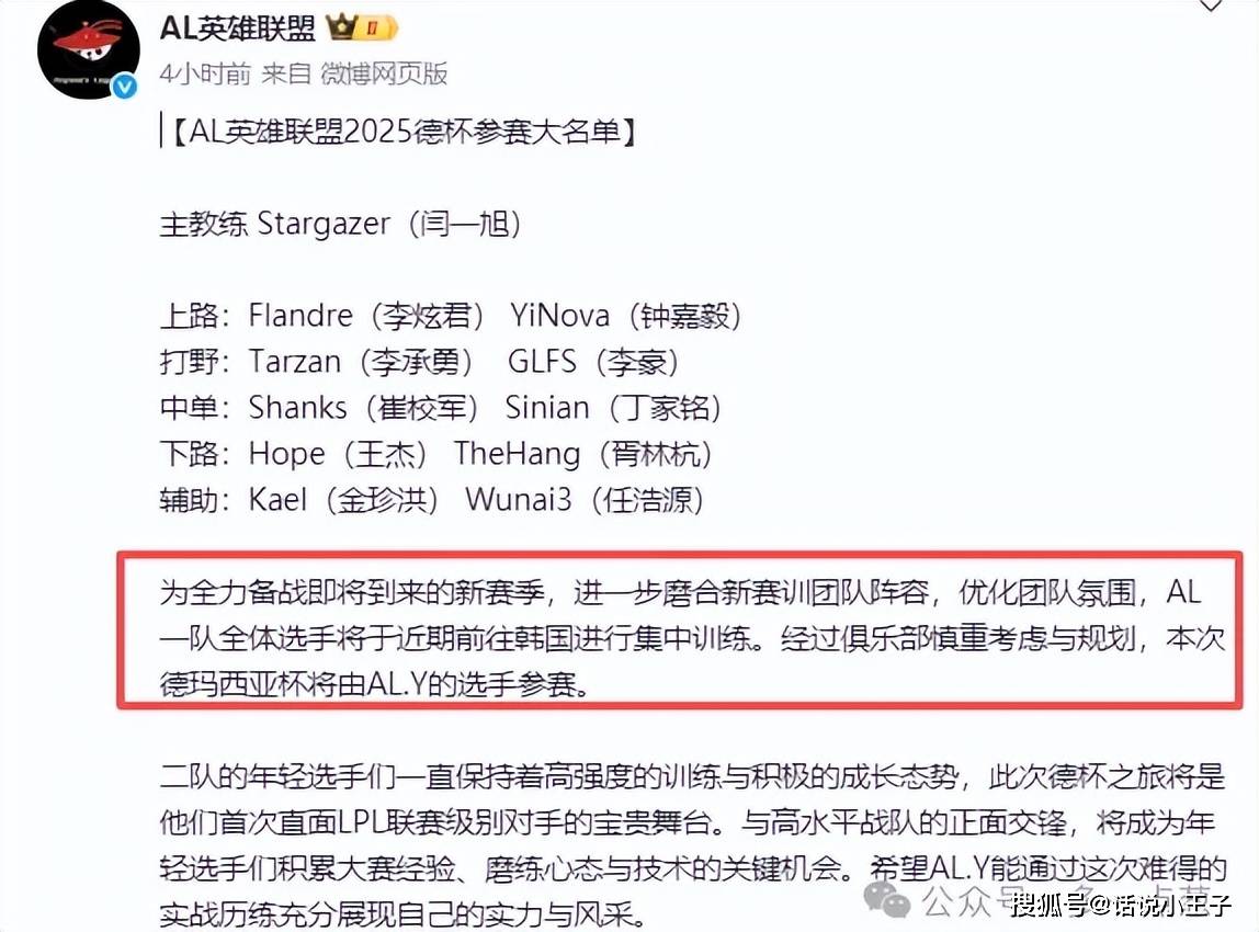 除此之外,AL参加此次德杯上的全部都是二队,没有一位主力选手,这在外界也引起了不少争议。AL官方也特地说明一队全部前往韩国进行集训,此番德杯也给二队一个表现的机会。