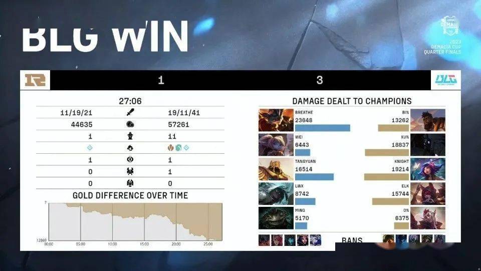 前情提要,RNG战队在今年转会期组建新阵容之后,在德杯中分到了一个很好的小组,几乎全程无压力地拿下全胜战绩晋级八强,但八强的比赛强度陡增,BLG这边是直接派出了自己的最强主力阵容。