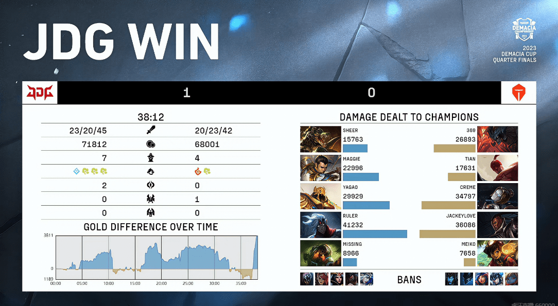 两支队伍的首局比赛打得异常胶着,双方在中期甚至经济差都不过几百。Tian在32分钟上演了一波精彩的抢大龙戏码,而JDG则是凭借龙魂团再次一波扭转乾坤。38分钟的激战爆发了43个击杀,这是一场战斗非常激烈的对决,双方攻防也的确赏心悦目。