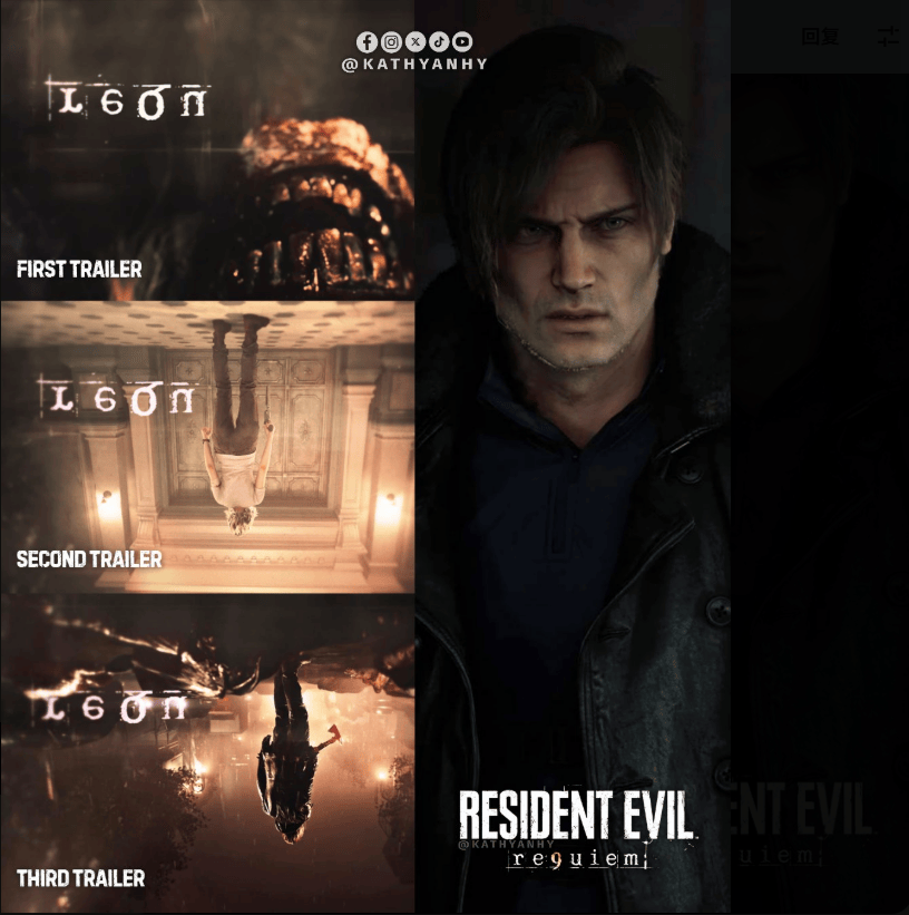 爆料来自X用户kathyanhy,他指出三支官方预告片(包括里昂没有出现的前两个)中隐藏的彩蛋,该彩蛋最初由玩家BLEACH_FAN001发现。关键是视频最后几秒的Logo,出现的游戏名“Requiem”(安魂曲),仔细观察由打字机打出的字样,如果将画面暂停,屏幕旋转180度,再将其镜像化,风格化的字幕可完美拼出“Leon”(里昂)这个单词。